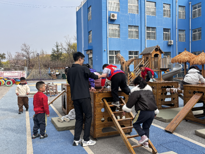 在户外游戏环节,志愿者分组引导幼儿参与各类趣味互动游戏。他们耐心示范、细致指导,鼓励孩子们积极动手、协同合作,在愉悦的氛围中不仅有效提升了幼儿的实践能力与团队意识,更使其深切感受到来自青年志愿者的真挚关爱。