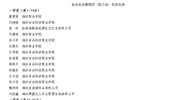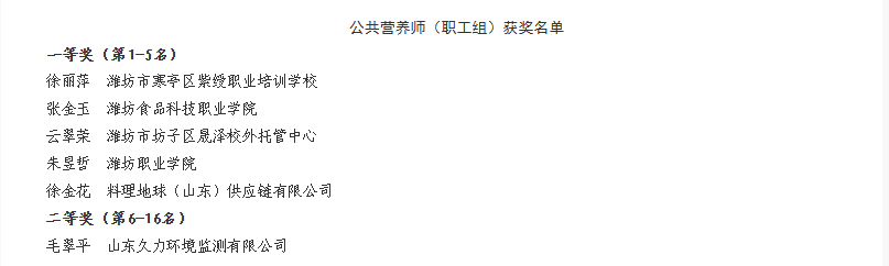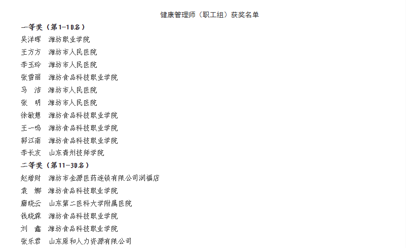 本届职业技能大赛由潍坊市人力资源和社会保障局、寒亭区人民政府主办,寒亭区人力资源和社会保障局承办,潍坊视康眼科医院等多家单位协办。我校食药学院教师团队积极备战,最终张金玉老师获公共营养师一等奖,刘俊峰等多名老师获食品安全管理师一等奖,张雪丽等多名老师获健康管理师一等奖,袁娜等多名老师获健康管理师二等奖。